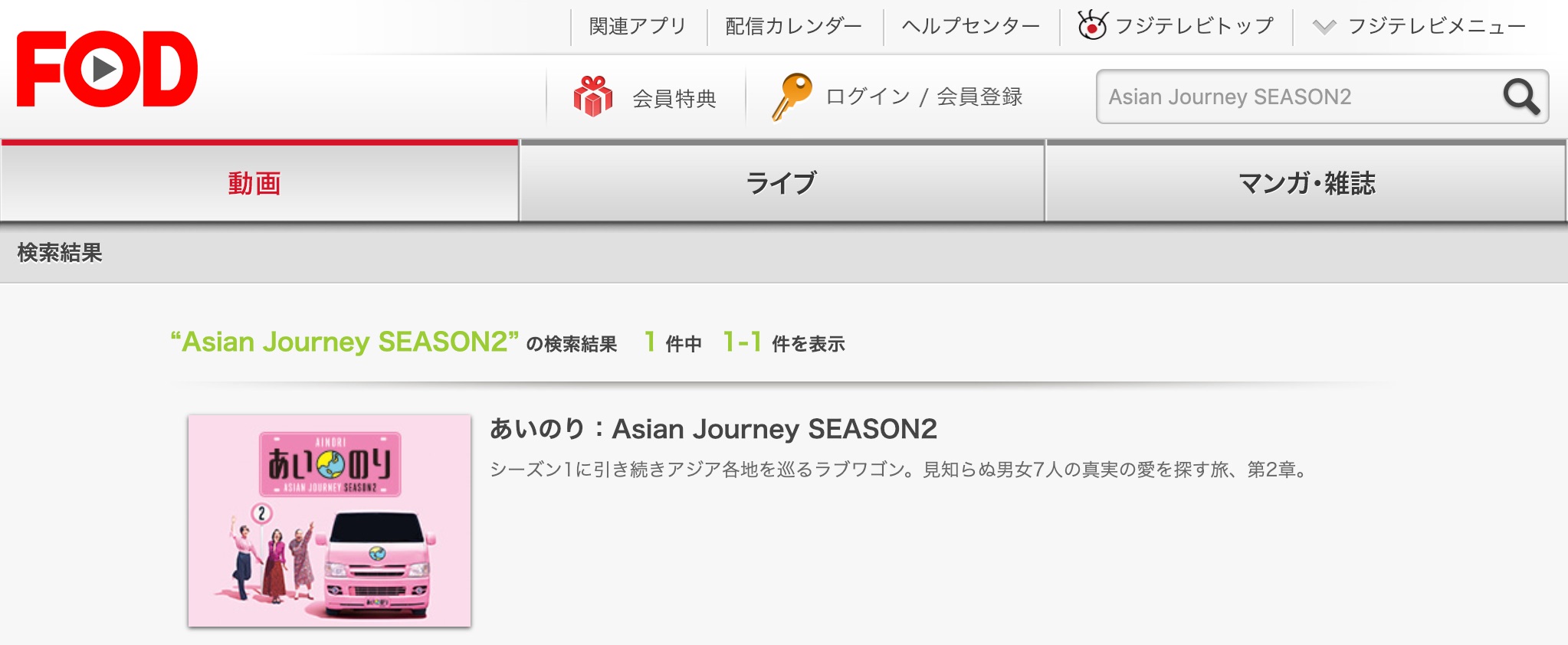 検索した結果は、【あいのりAsian Journey SEASON2】はFODプレミアムで配信されていました。