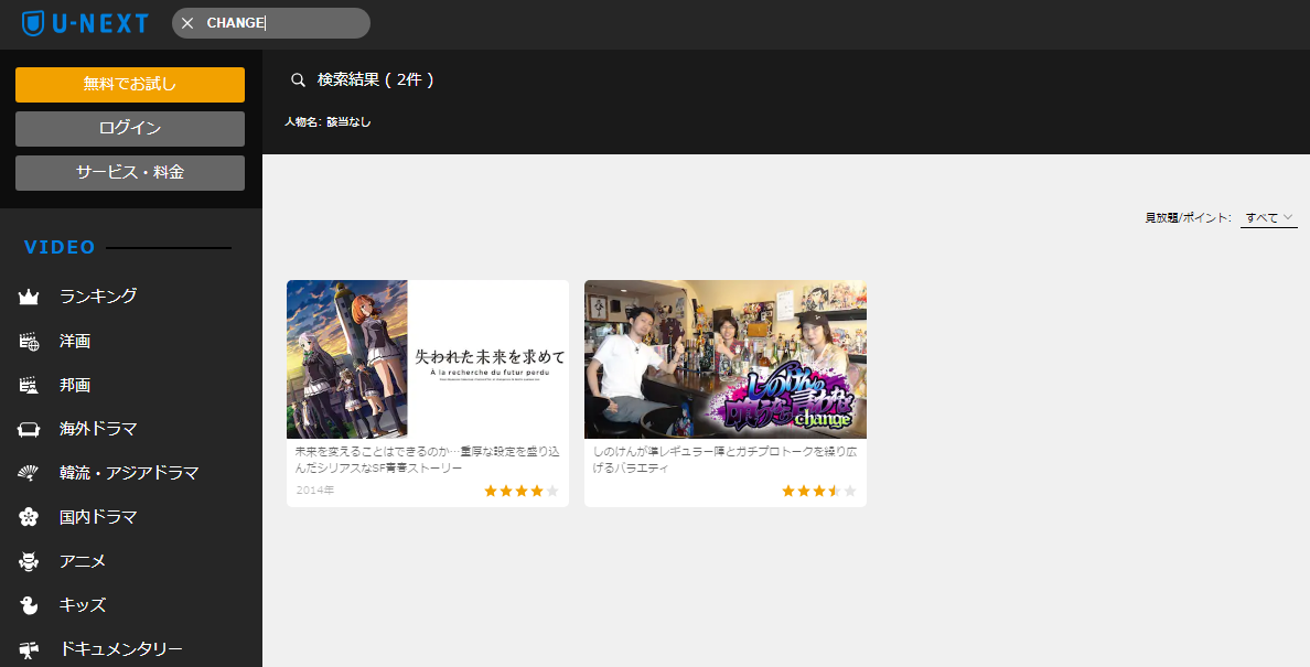 U-NEXTで、【CHANGE】は配信されているのか検索窓に「CHANGE」と入力し検索しました。