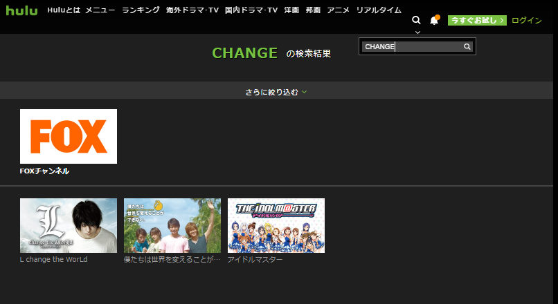 Huluで、【CHANGE】は配信されているのか検索窓に「CHANGE」と入力し検索しました。