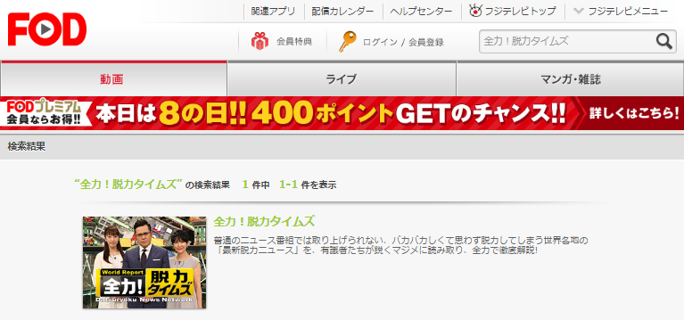 検索した結果は、【全力!脱力タイムズ】はFODプレミアムで配信されていました。