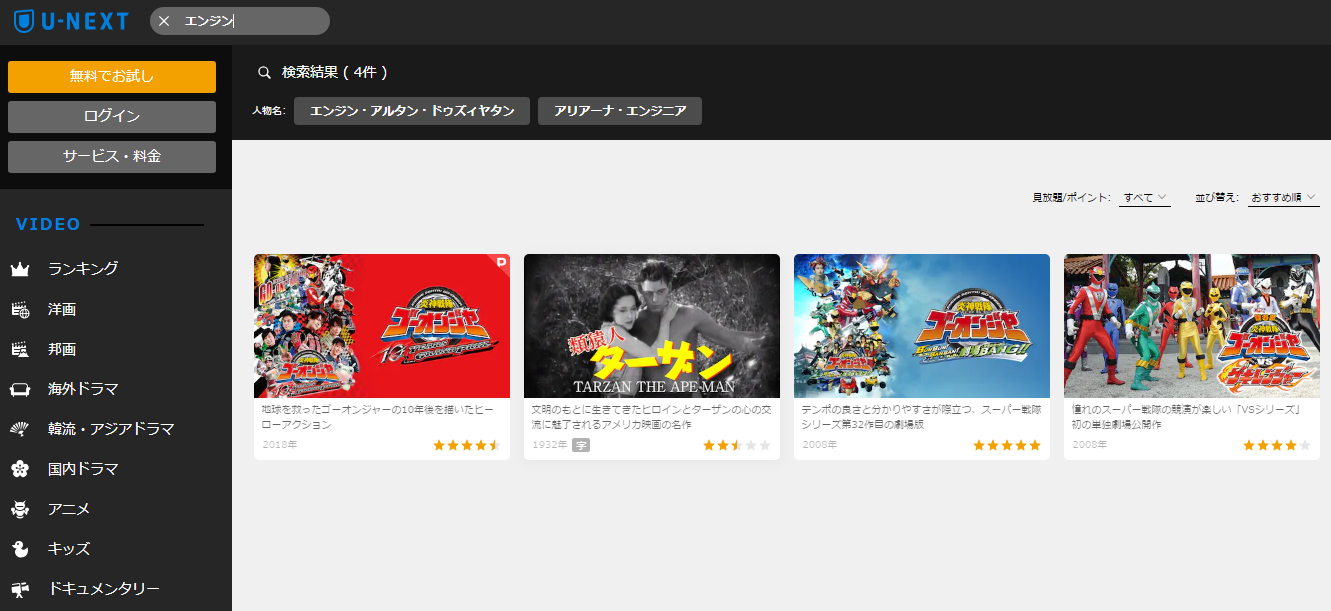 U-NEXTで、【エンジン】は配信されているのか検索窓に「エンジン」と入力し検索しました。