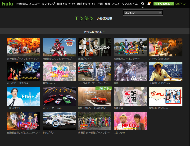 Huluで、【エンジン】は配信されているのか検索窓に「エンジン」と入力し検索しました。