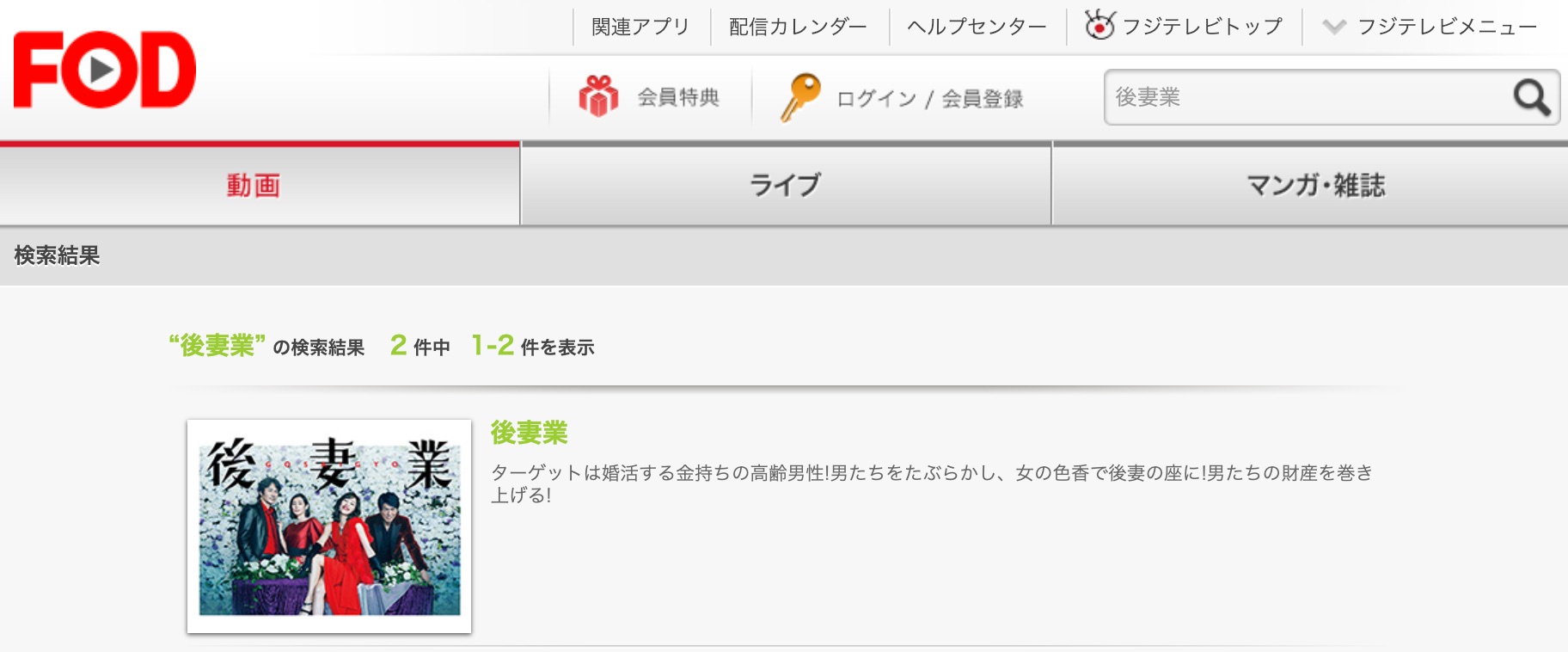 検索した結果は、ドラマ【後妻業】はFODプレミアムで配信されていました。