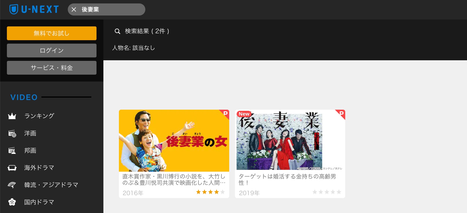 検索した結果は、ドラマ【後妻業】はU-NEXTで配信されていました。