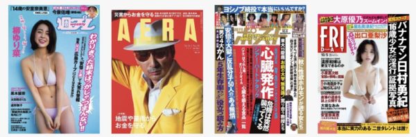 ・女性セブン ・女性自身 ・週間アサヒ芸能 ・SPA! ・FLASH ・サンデー毎日 ・ニューズウィーク日本版 ・週間朝日 ・AERA ・週間ポスト ・週間現代 ・週プレ ・週間東洋経済 ・週間ダイヤモンド ・FRIDAY ・SAPIO ・MAMOR ・FLASHスペシャル グラビアBEST [/su_spoiler]