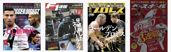 ・週間プロレス ・週間ベースボール ・BE-PAL ・ワールドサッカーダイジェスト ・F1速報 ・EVEN ・GOLF TODAY ・つり情報 ・GO OUT ・RIDERS CLUB ・つり人 ・アルバトロス・ビュー ・サッカーダイジェスト ・スマッシュ ・BICYCLE CLUB ・PEAKS ・サーフトリップジャーナル ・ランドネ[/su_spoiler]