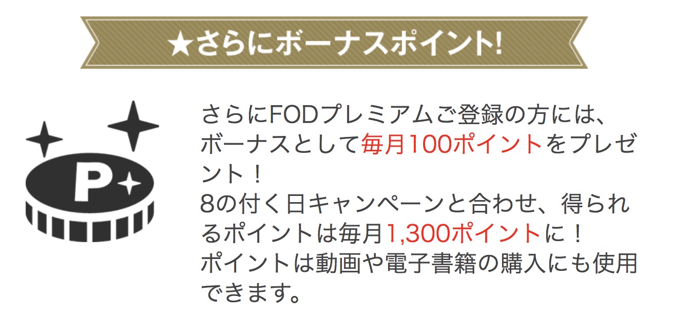 FODプレミアムは、毎月100ポイントと8の付く日に400ポイント