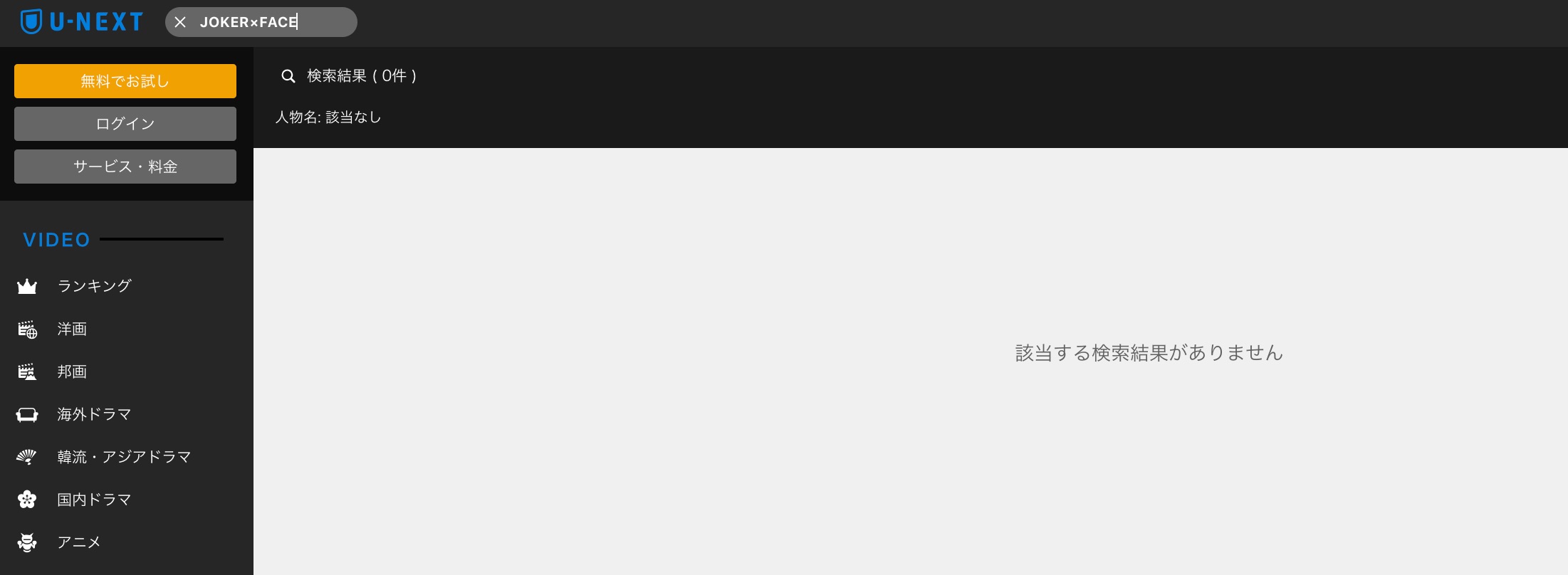 検索した結果、【JOKER×FACE】はU-NEXTでは配信されていませんでした。