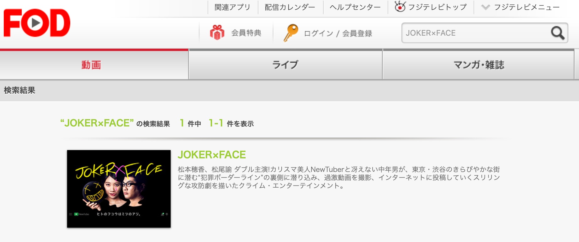 検索した結果は、【JOKER×FACE】はFODプレミアムで配信されており無料視聴可能です!