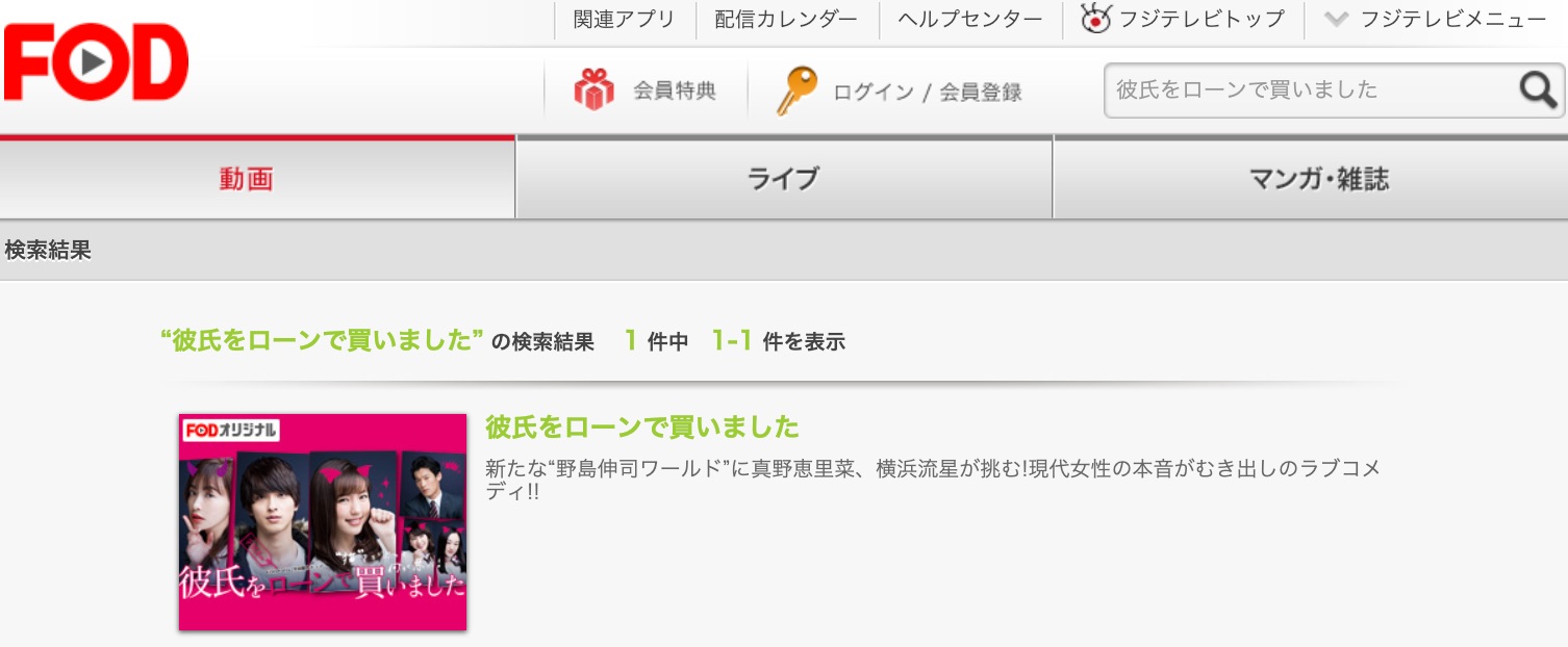 検索した結果は、【彼氏をローンで買いました】はFODプレミアムで配信されていました。