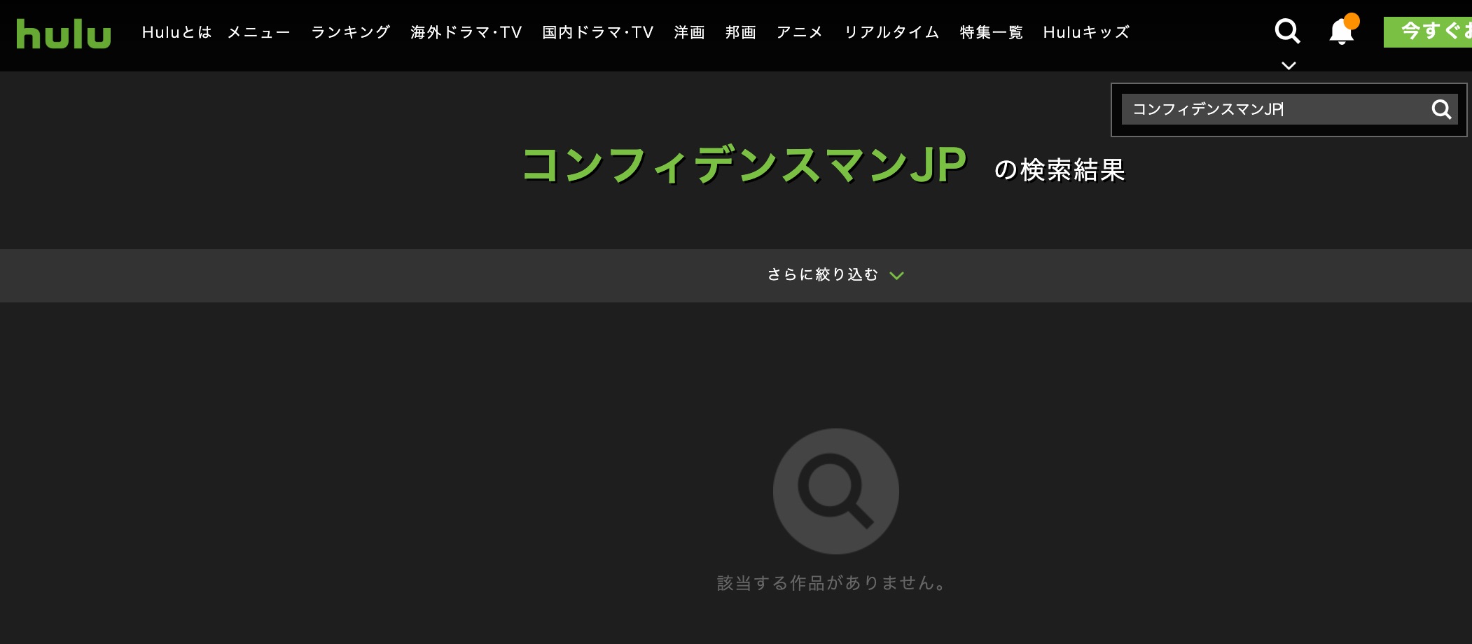 検索した結果、【コンフィデンスマンJP】はHuluで配信されていませんでした。