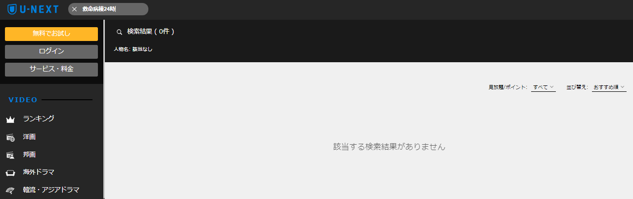 検索した結果、【救命病棟24時】はU-NEXTで配信されていませんでした。