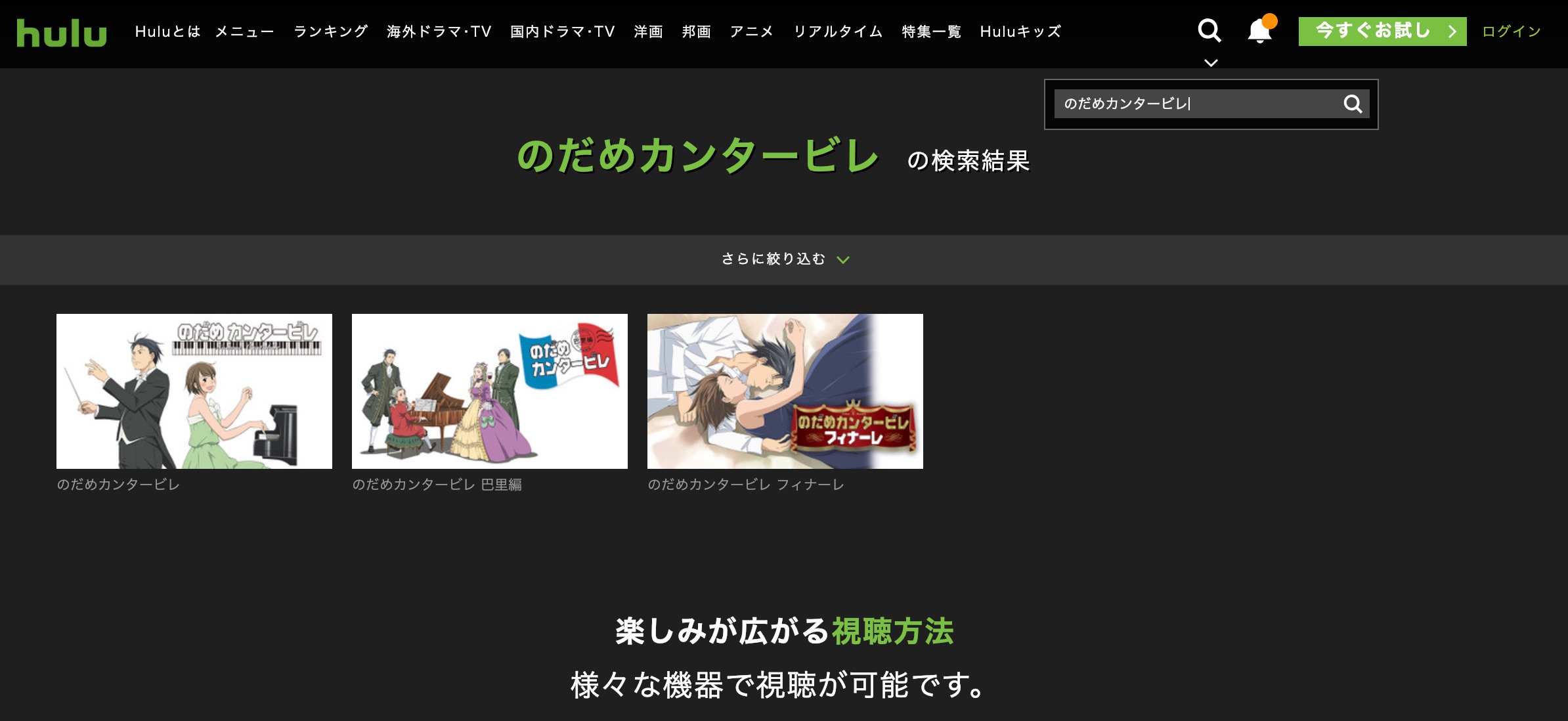 検索した結果、アニメは配信されていますが、ドラマ【のだめカンタービレ】はHuluで配信されていませんでした。