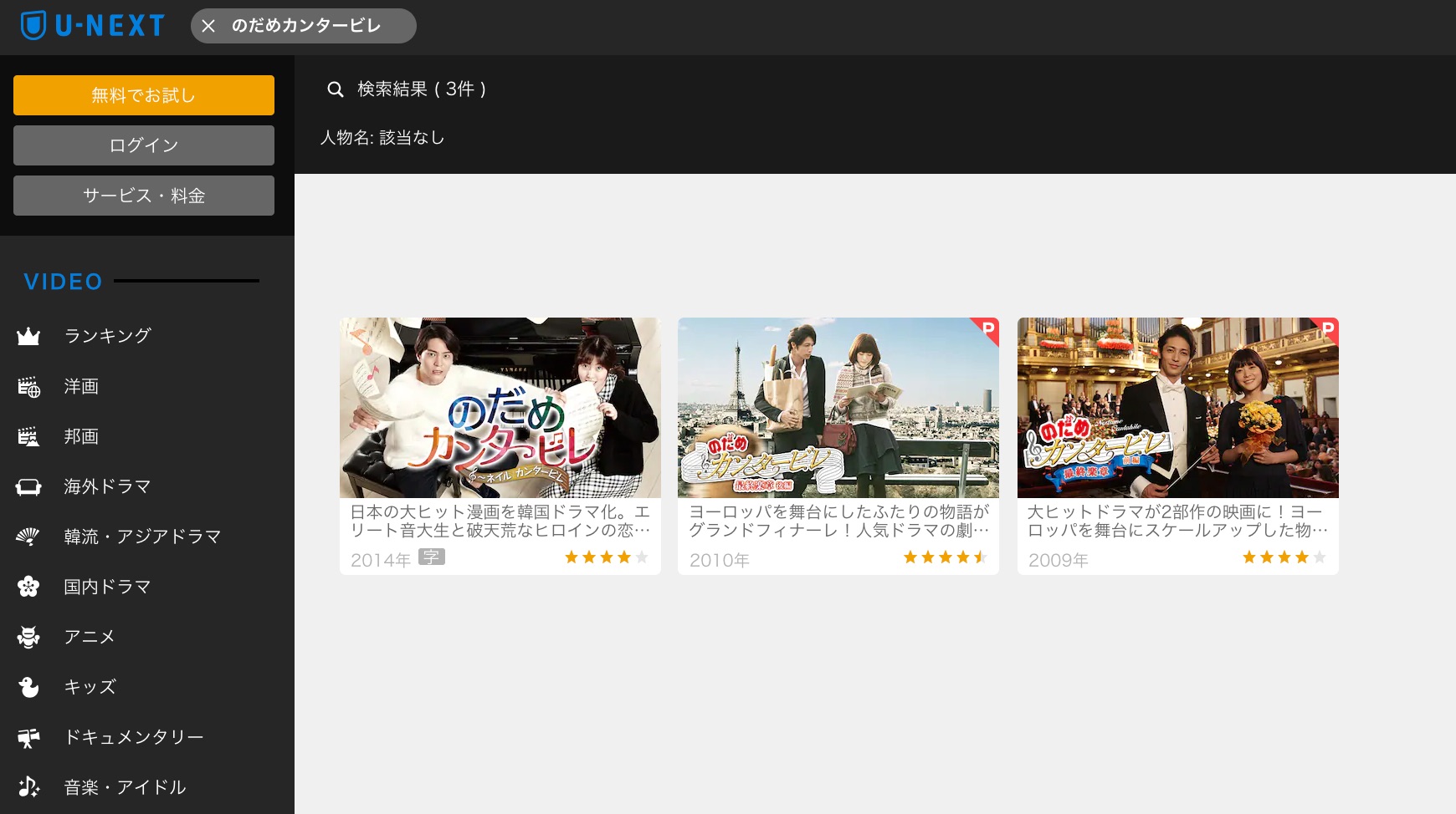 検索した結果、韓国版と映画版は配信されていましたが、ドラマ【のだめカンタービレ】はU-NEXTで配信されていませんでした。