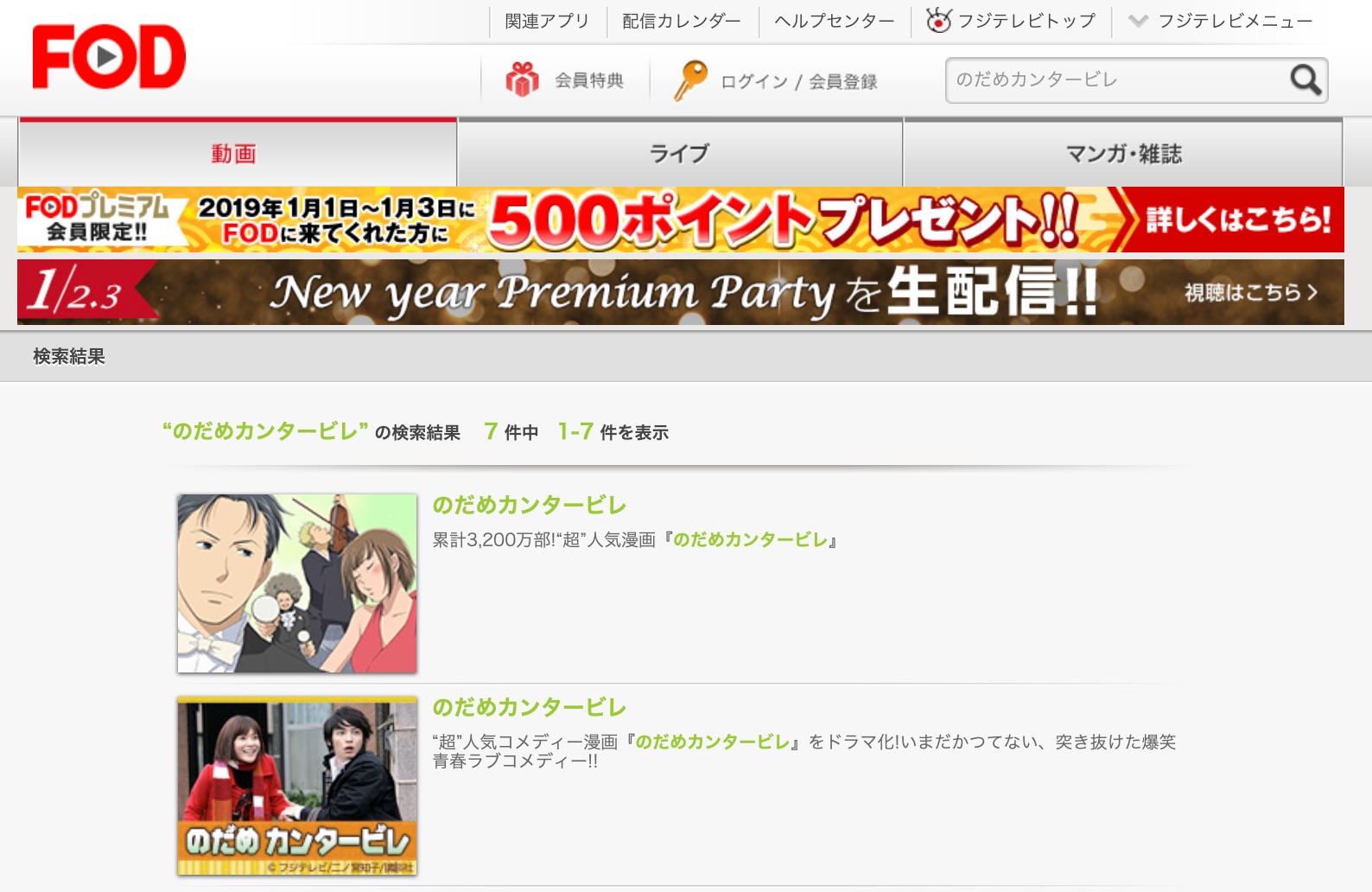 検索した結果は、ドラマ【のだめカンタービレ】はFODプレミアムで配信されていました。