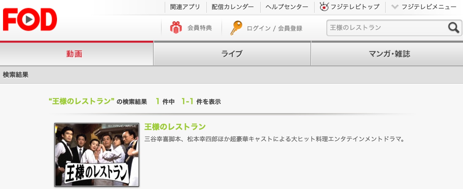 検索した結果は、【王様のレストラン】はFODプレミアムで配信されていました。