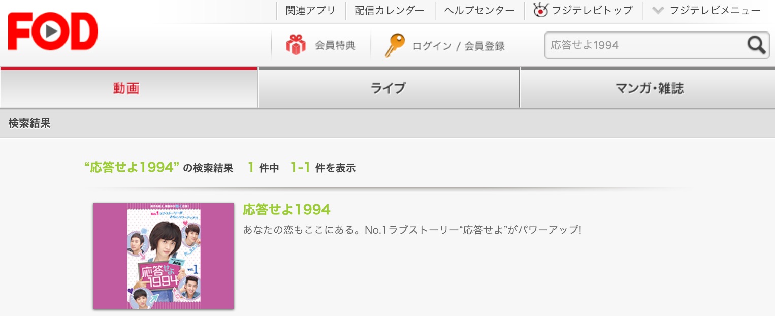 検索した結果は、【応答せよ1994】はFODプレミアムで配信されていました。