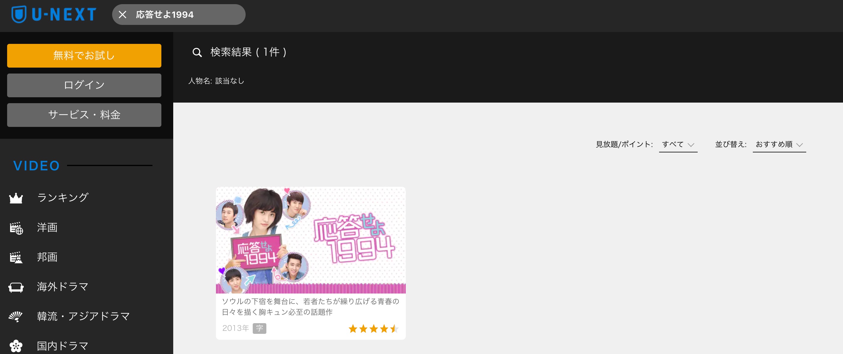 検索した結果、【応答せよ1994】はU-NEXTで配信されていました。