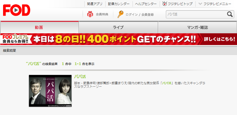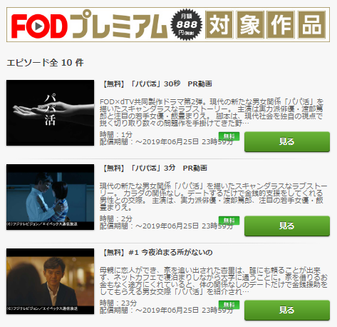 検索した結果は、【パパ活】はFODプレミアムで配信されていました。