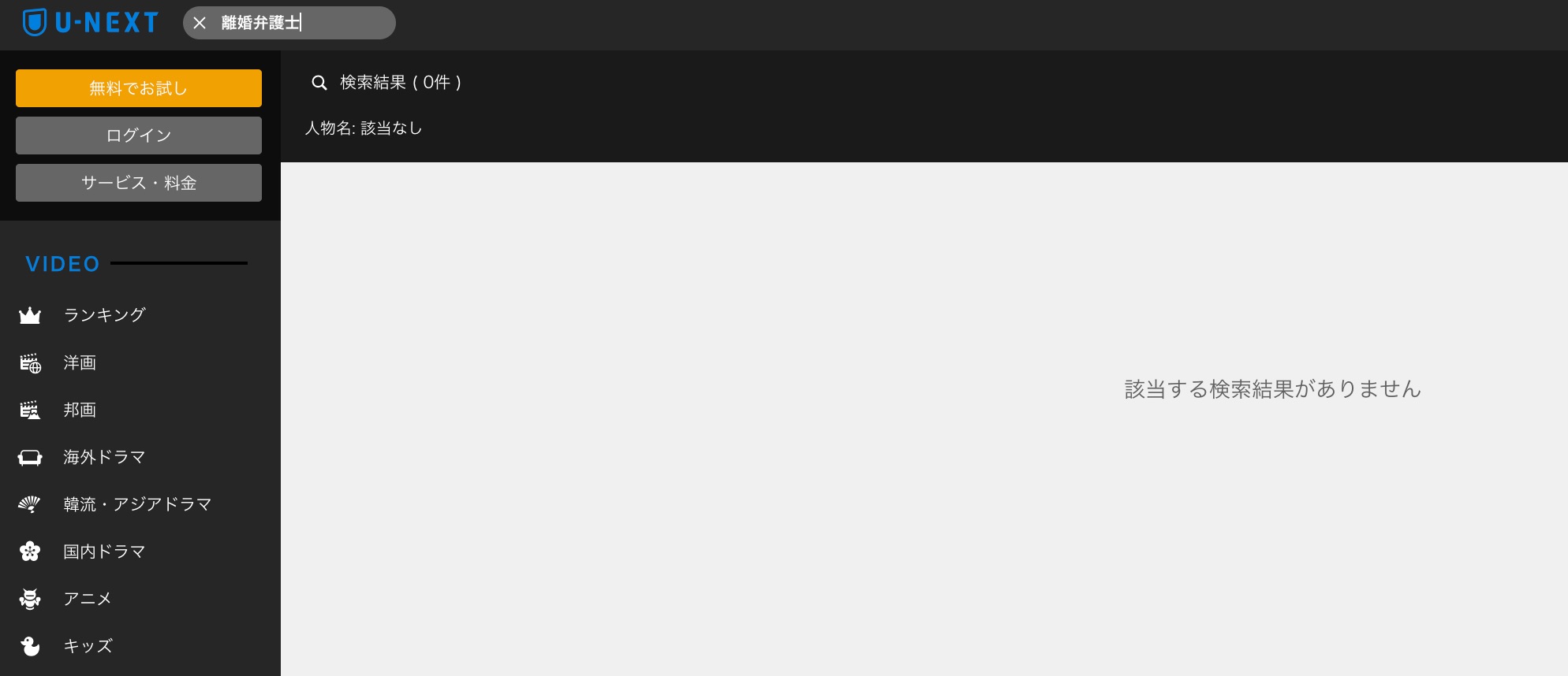 検索した結果、【離婚弁護士】はU-NEXTでは配信されていませんでした。