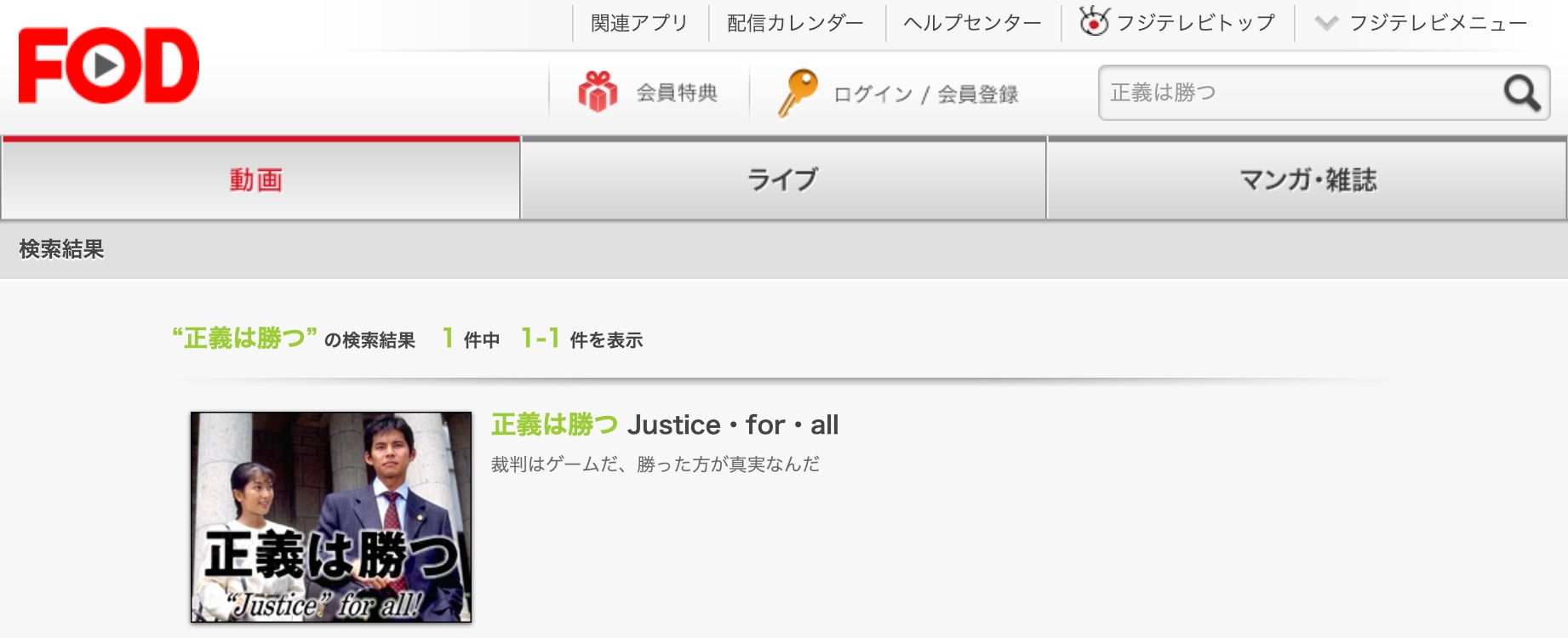 検索した結果は、【正義は勝つ】はFODプレミアムで配信されており無料視聴可能です!