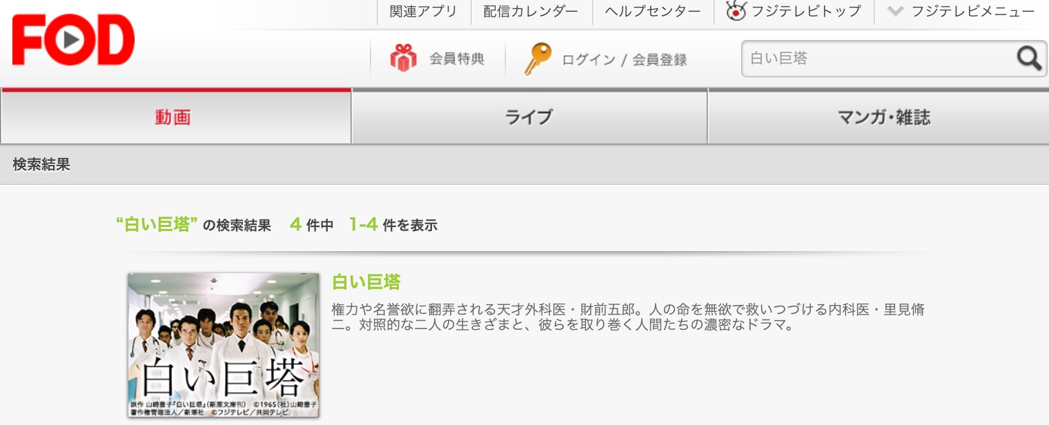 検索した結果は、【白い巨塔】はFODプレミアムで配信されていました。