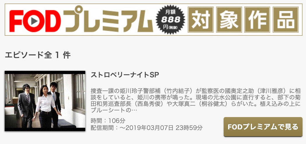 検索した結果は、【ストロベリーナイト】はFODプレミアムで配信されていました。