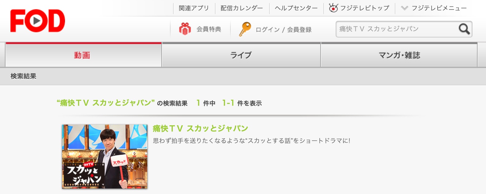 検索した結果は、【痛快TV スカッとジャパン】はFODプレミアムで配信されていました。