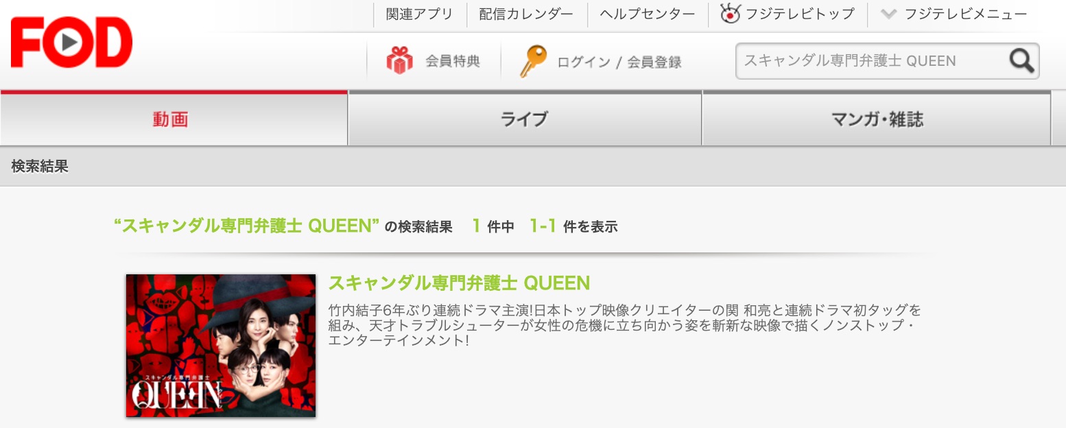 FODプレミアムで検索した結果は、【スキャンダル専門弁護士 QUEEN】は配信されていました。