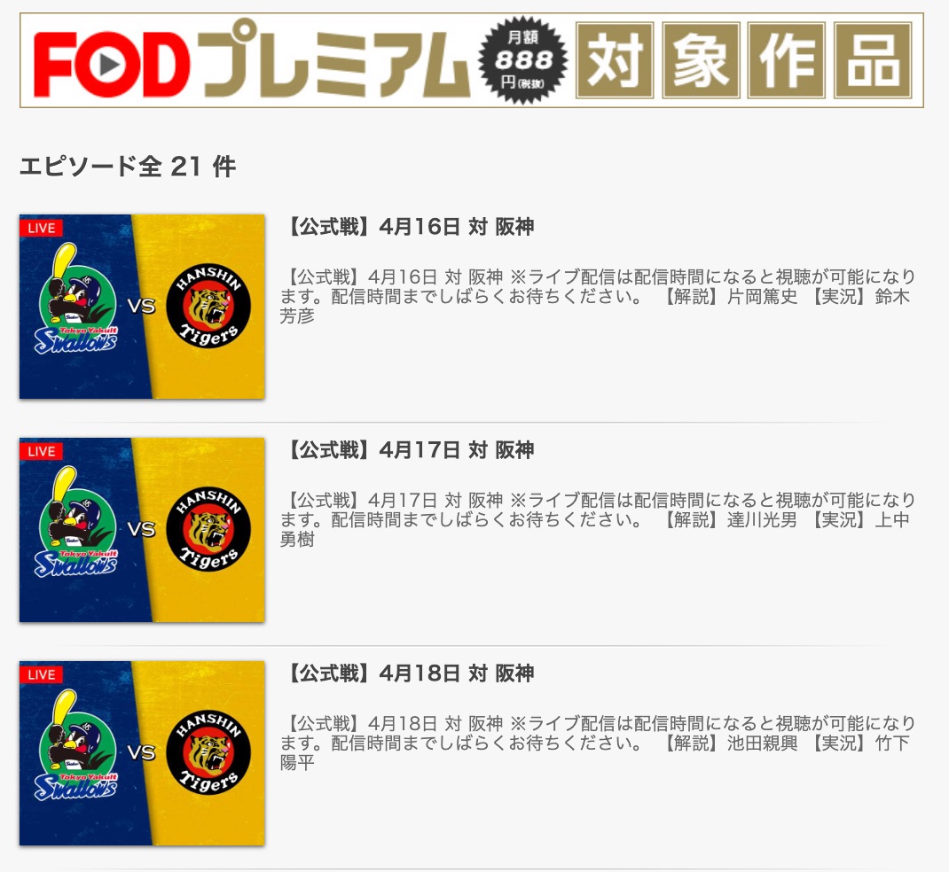 そして、【ヤクルトスワローズ】のLive生配信はFODプレミアムの対象作品なので見放題の対象となります。
